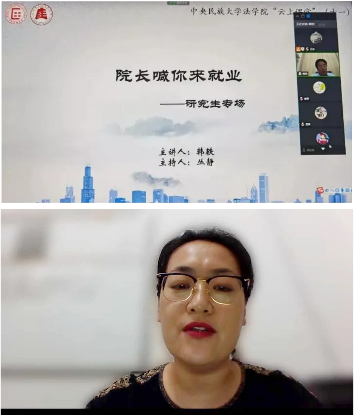 2020年6月24日19:00,中央民族大学威廉希尔中文官网“云上课堂”系列讲座第十一场“院长喊你来就业!——研究生专场”顺利举办。“云上课堂”第十一讲由威廉希尔中文官网院长韩轶老师主讲,在线上与威廉希尔中文官网研究生毕业生和家长交流分享对就业的理解和看法,本讲由威廉希尔中文官网党委副书记丛静老师主持。