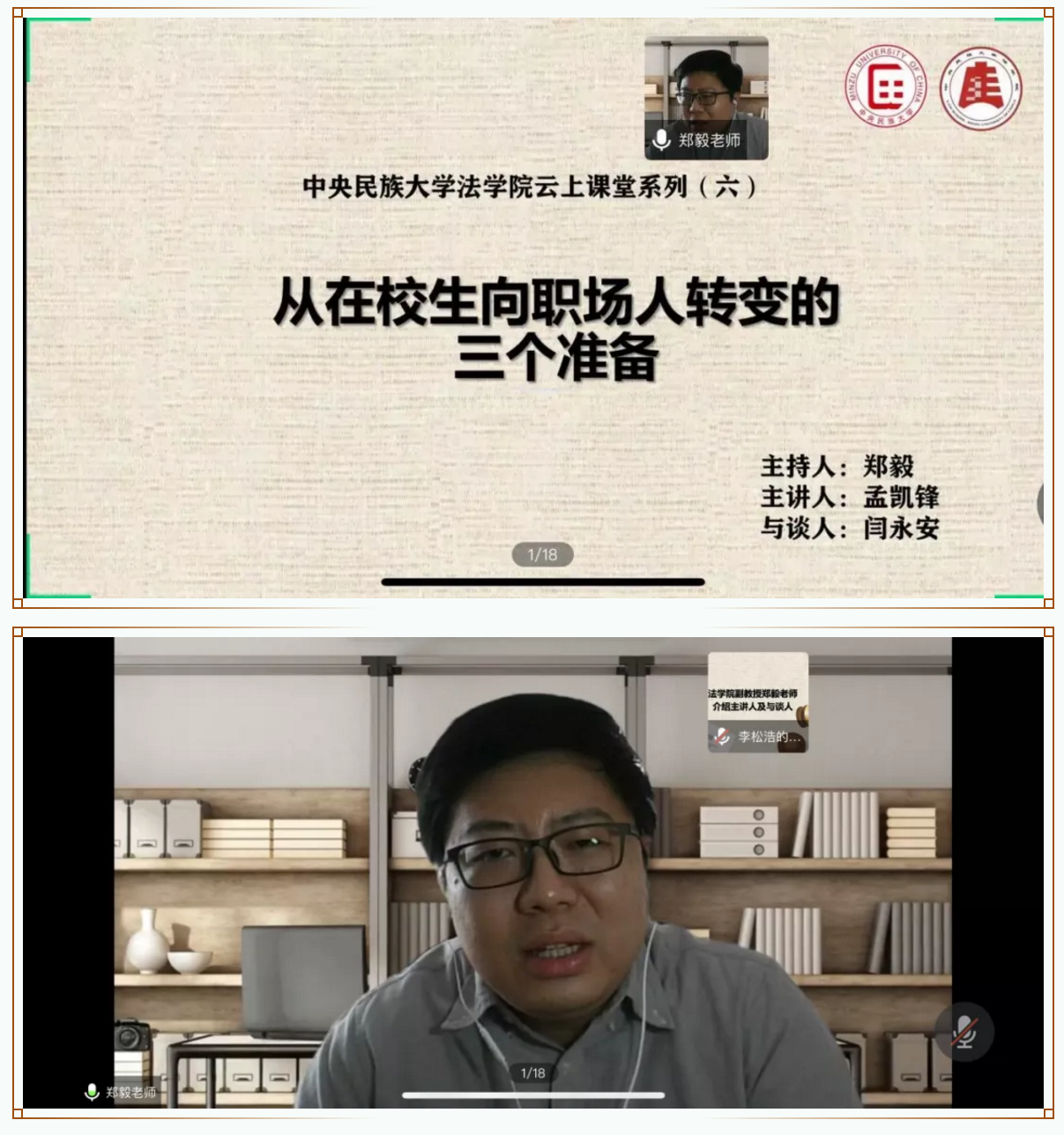 2020年6月10日下午3点,中央民族大学威廉希尔中文官网“云上课堂”系列讲座第六场“从在校生向职场人转变的三个准备”顺利举办。“云上课堂”第六讲由中央民族大学威廉希尔中文官网优秀院友、北京市海淀区人民法院执行局第六团队长孟凯锋法官主讲,中央民族大学威廉希尔中文官网闫永安老师担任本次课堂的与谈人,威廉希尔中文官网师生共同聆听。本次课堂由威廉希尔中文官网副教授郑毅老师主持。