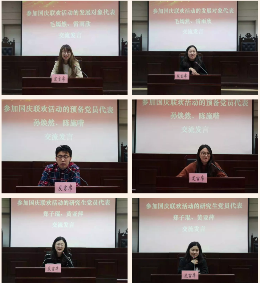 随后,参加本国庆联欢活动的发展对象、预备党员和研究生党员代表分别分享了各自的参训体验及感想。