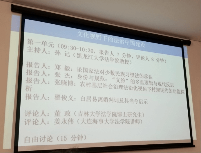 20191027日,由大连海事大学威廉希尔中文官网、吉林大学威廉希尔中文官网、辽宁省法学会法理学研究会、吉林省法学会法治文化建设研究会主办,大连海事大学基层治理法律社会学创新团队承办的东北地区第二届“文化视野下的法治中国建设”学术研讨会在大连和怡阳光酒店举行。我院郑毅老师应邀出席会议,并于会议第一单元作了《论国家法对少数民族习惯法的承认》的主题报告。