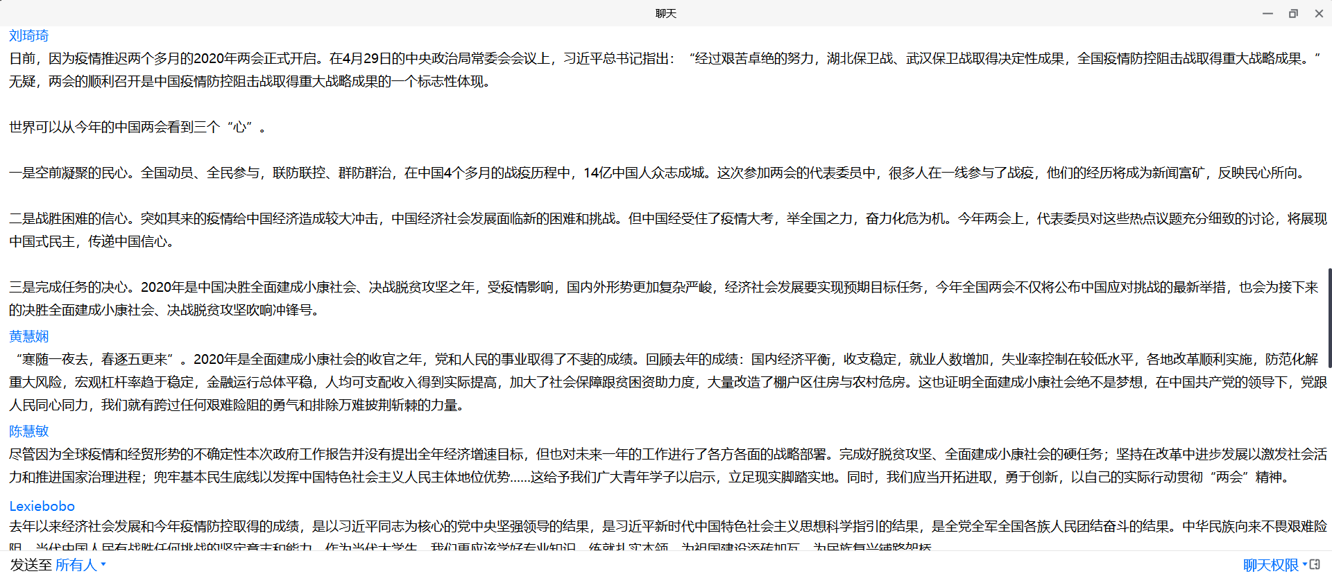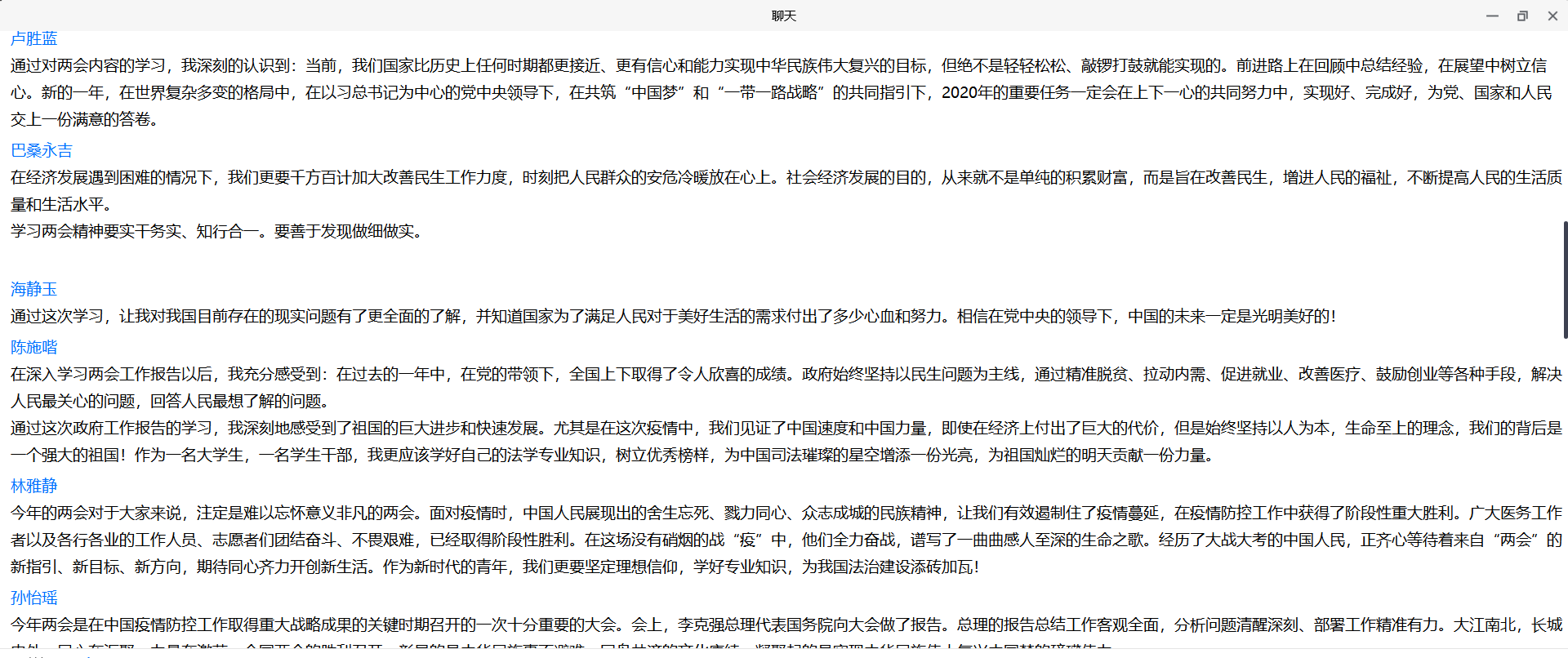 随后,同学们交流分享了对两会内容的学习成果及感悟,各抒己见。
