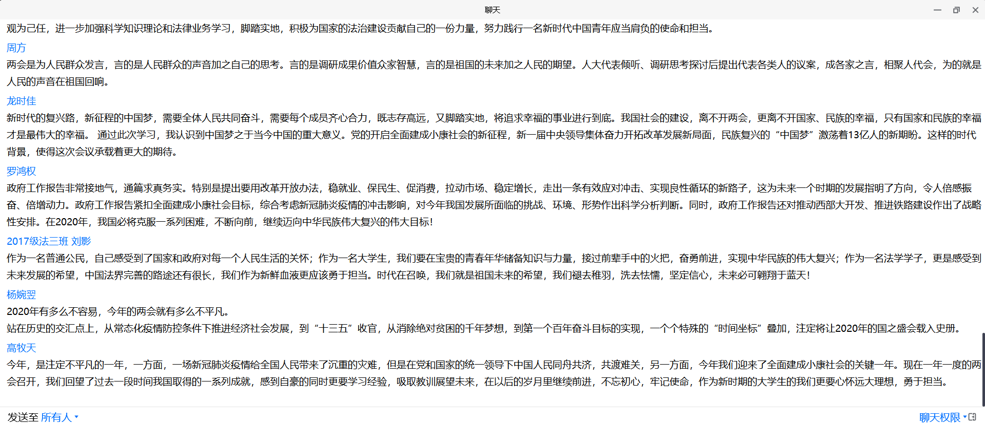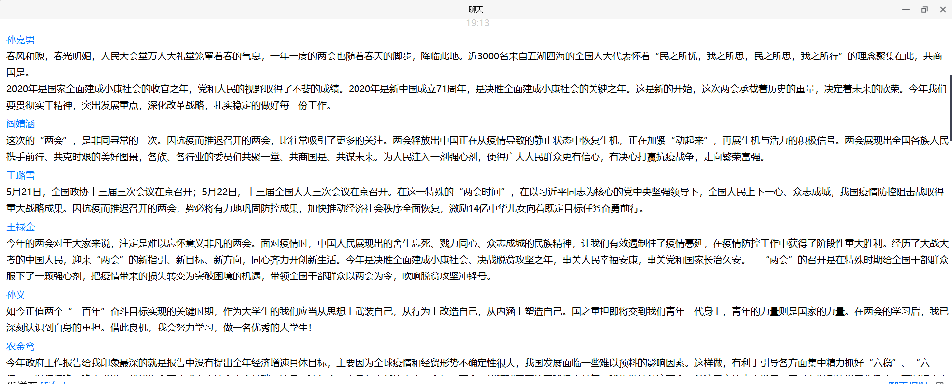 全国两会是中国人民最重要的政治生活之一,是一个讨论、协商、决定国计民生大事的大会,在收听收看了两天的会议过程和两会的动态报道后,我们通过腾讯会议展开了关于两会的学习讨论,同学们踊跃发言、个抒感想,让我感受到青年学生不仅是“一心只读圣贤书”的一代人,更是“风声雨声读书声声声入耳,家事国事天下事事事关心”的有担当的一代,值得信赖的一代。青年人是奔涌的后浪,今后,我们一定会更加紧密团结在以习近平同志为核心的党中央坚强领导周围,同全国各族人民团结奋斗,实现中华民族伟大复兴而贡献出自己的力量!